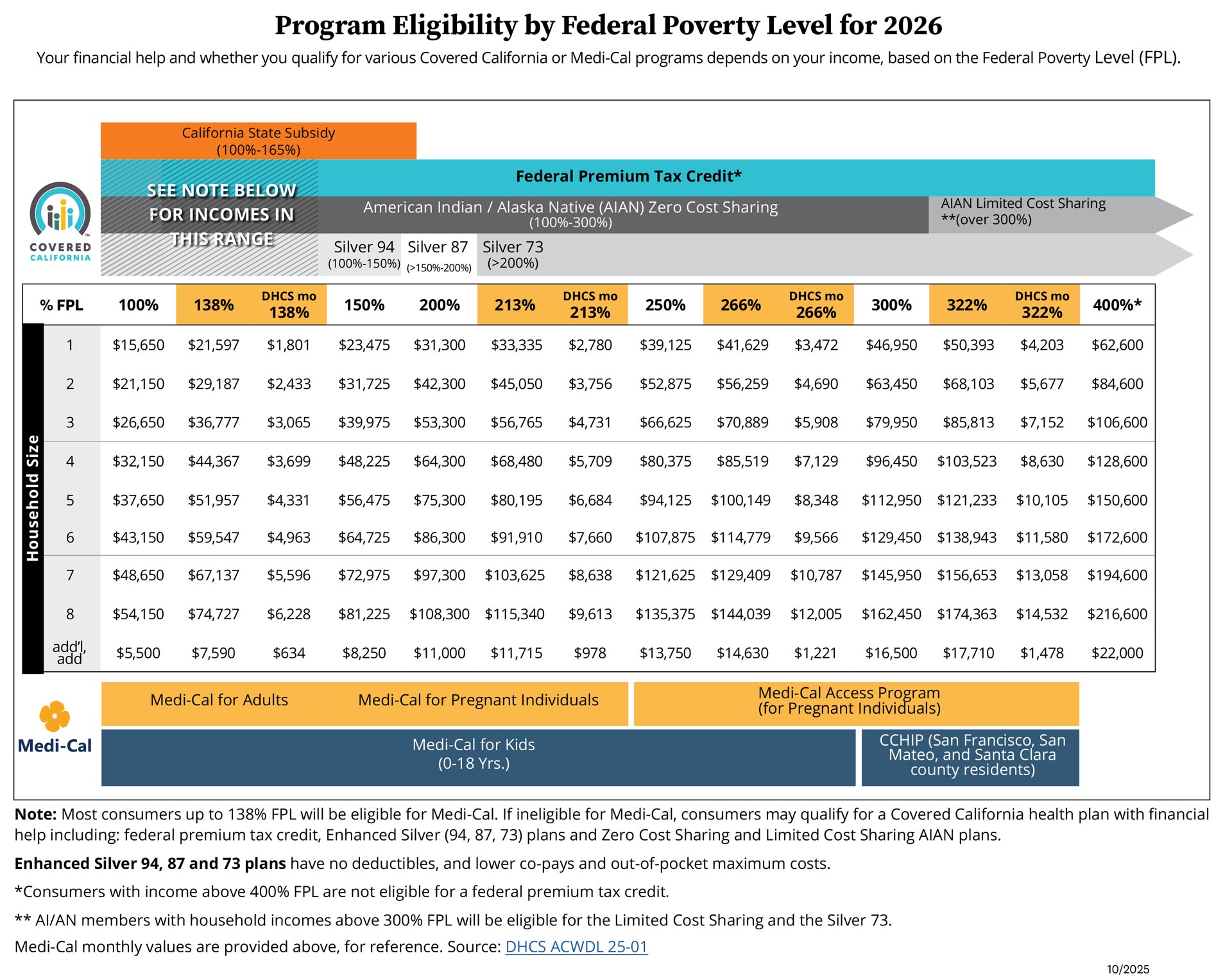 In order to make insurance less of a burden to a family, we look to the Federal Poverty Level (FPL) to see where your income indicates you are. If your income falls between zero and 138% of the FLP, then you should take advantage of the new and improved Medi-Cal system (the Federal Medicaid system).